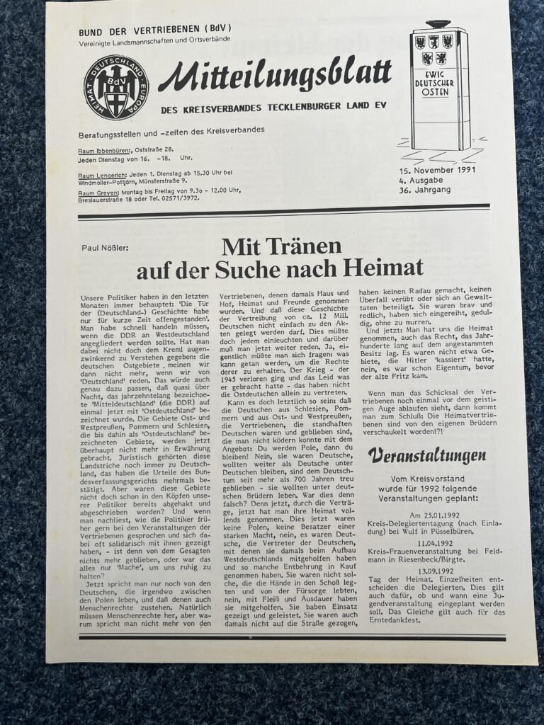 Weiterhin wurde eine fast komplette Sammlung aller Ausgaben der „Mitteilungsblätter“, der Publikation des Bundes der Vertriebenen (BdV) Kreisverband Tecklenburger Land, übergeben. Diese Zeitung, die vierteljährlich erschien, wurde seit den 1970er Jahren bis 2004 durch Paul Hohmann und Paul Nößler erstellt.